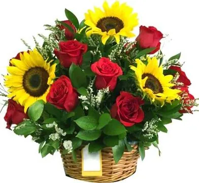 Elegante e solare composizione in cesto con Rose e Girasoli, confezionata con verde decorativo di stagione. Esprime amore, passione e felicità. Adatta per occasioni come nascita, amore, felicitazioni, compleanni, matrimoni, anniversari e inaugurazioni.