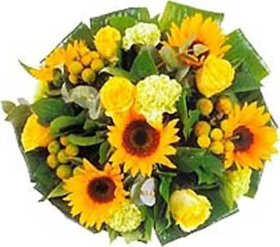 Mazzo di roselline, girasoli e fiori misti di stagione dai toni solari, confezionato con verde decorativo. Esprime amore, allegria e felicità. Adatto per occasioni come nascita, amore, felicitazioni, compleanni, matrimoni, anniversari e inaugurazioni.