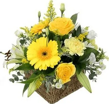 Composizione in cesto di roselline, gerbere, lisianthus e fiori misti di stagione dai toni solari, confezionata con verde decorativo. Esprime allegria e felicità. Adatta per occasioni come nascita, amore, felicitazioni, compleanni e amicizia.