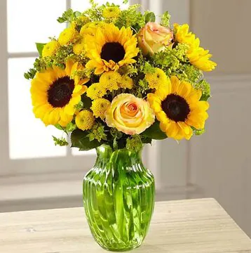 Solare Composizione di Girasoli Confezionato a Tono con Verde Decorativo di Stagione. Esprime Gioia, Affetto ed Energia. Adatto per occasioni come Compleanni, Amicizia, Amore, Felicitazioni, Matrimoni, Nascita, Anniversari e Inaugurazioni.