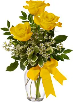 Tre Rose Gialle di Prima Scelta in Elegante Confezione con Verde Misto Decorativo di Stagione. Esprime Amore, Allegria e Felicità. Adatto per occasioni come Nascita, Amore, Felicitazioni, Compleanni, Matrimoni, Anniversari e Inaugurazioni.