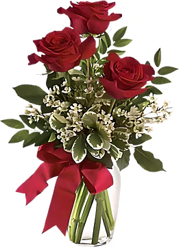 Tre Rose Rosse Big di Prima Scelta con Verde Misto decorativo in elegante confezione a tono. Un'ottima scelta per le Tue occasioni romantiche e d'affetto.