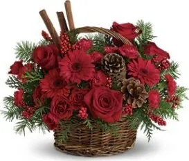 Invia Fiori a Ceranova, vendita online Cesto di Natale con Roselline, Gerbere e Verde decorativo Natalizio