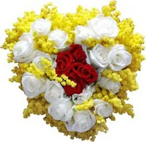 Raffinata composizione di Mimosa a forma di Cuore con Rose Rosse e Bianche realizzata per l'occasione della Festa della Donna