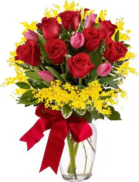 Invia Fiori a Ceranova, vendita online Mimosa con Rose Rosse e Tulipani