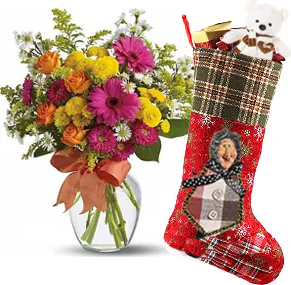 Calza della Befana con Bouquet di Gerbere e Fiori Misti di Stagione con Verde Decorativo e Confezione a Tono. Con Dolciumi e Leccornie assortite. Modello e Marca secondo Disponibilità al momento in Negozio