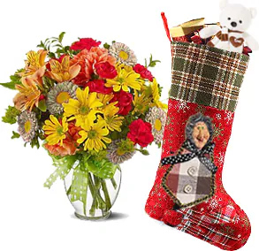 Calza della Befana con Bouquet di Fiori Misti Colorati di Stagione e Verde Decorativo in Confezione a Tono. Con Dolciumi e Leccornie assortite. Modello e Marca secondo Disponibilità al momento in Negozio