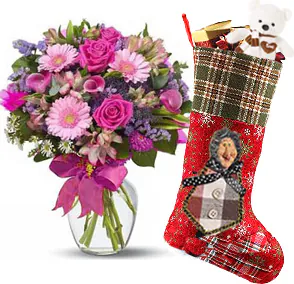 Calza della Befana con Bouquet di Rose e Fiori Misti di Stagione in Confezione a Tono e Verde decorativo. Con Dolciumi e Leccornie assortite. Modello e Marca secondo Disponibilità al momento in Negozio