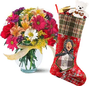Calza della Befana con Bouquet di Fiori Misti Colorati con Verde Decorativo di Stagione in Confezione a Tono. Con Dolciumi e Leccornie assortite. Modello e Marca secondo Disponibilità al momento in Negozio