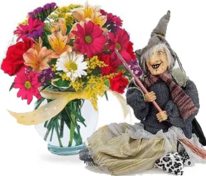 Befana di Stoffa con Bouquet di Fiori Misti Colorati con Verde Decorativo di Stagione in Confezione a Tono. Con Dolciumi e Leccornie assortite. Modello e Marca secondo Disponibilità al momento in Negozio