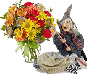 Befana di Stoffa con Bouquet di Fiori Misti Colorati di Stagione e Verde Decorativo in Confezione a Tono. Con Dolciumi e Leccornie assortite. Modello e Marca secondo Disponibilità al momento in Negozio