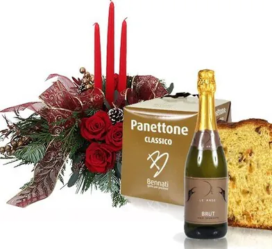 Augura un buon Natale con un centrotavola con 3 rose rosse, verde decorativo e candele, abbinato ad un panettone ed una bottiglia di spumante. Adatto per le festività natalizie.