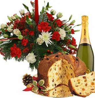 Augura un buon Natale con un centrotavola di rose e fiori misti di stagione dai toni rossi e bianchi, verde decorativo e candela, abbinato ad un panettone ed una bottiglia di spumante. Adatto per le festività natalizie.