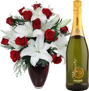 Invia Fiori a Rosignano, vendita online 12 rose rosse e gigli o lilium dai toni chiari con spumante