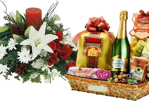 Augura un buon Natale con un centrotavola di rose, gigli o lilium e fiori misti di stagione dai toni bianchi e rossi, verde decorativo e candele, abbinato ad un cesto di prodotti tipici con panettone e spumante. Adatto per le festività natalizie.
