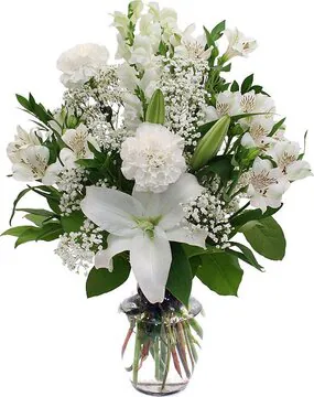 Mazzo funebre di gigli o lilium, alstroemerie, garofani e fiori misti di stagione dai toni chiari e verde decorativo. Adatto per occasioni come lutto e funerale per esprimere cordoglio e porgere le vostre più sentite condoglianze alle persone care.
