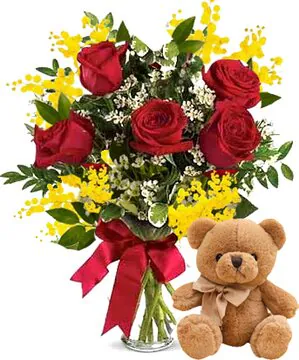 Invia Fiori a Sanremo, vendita online Mimosa con 5 Rose Rosse e Peluche