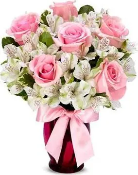 Rose Rosa e Alstroemerie con Verde Decorativo di Stagione in Elegante Confezione a Tono. Esprime amore, allegria e felicità. Adatto per occasioni come nascita, amore, felicitazioni, compleanni e amicizia.