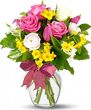 Roselline e Fiori Misti Colorati di Stagione con Verde decorativo e confezione a Tono. Grazioso Bouquet Fresco e Profumato adatto per tutte le occasioni.