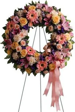 Lussuosa corona funebre di rose, lilium, gerbere e fiori misti di stagione dai toni pastello e verde decorativo. Adatta per occasioni come lutto e funerale per esprimere cordoglio e porgere le vostre più sentite condoglianze alle persone care.