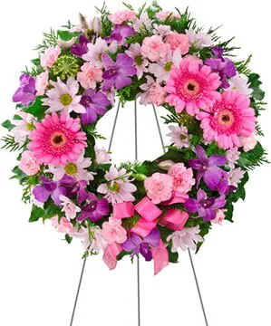 Lussuosa corona funebre di gerbere e/o margherite, garofani e fiori misti di stagione dai toni accesi e verde decorativo. Adatta per occasioni come lutto e funerale per esprimere cordoglio e porgere le vostre più sentite condoglianze alle persone care.