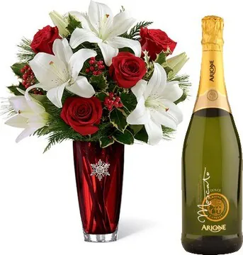 Augura un buon Natale con un bouquet di roselline rosse e gigli o lilium dai toni chiari confezionato con verde decorativo di stagione, abbinato ad una bottiglia di spumante. Adatto per le festività natalizie.