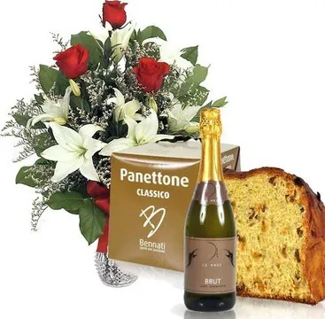 Augura un buon Natale con un bouquet di 3 rose rosse e gigli o lilium dai toni chiari confezionato con verde decorativo di stagione, abbinato ad un panettone ed una bottiglia di spumante. Adatto per le festività natalizie.