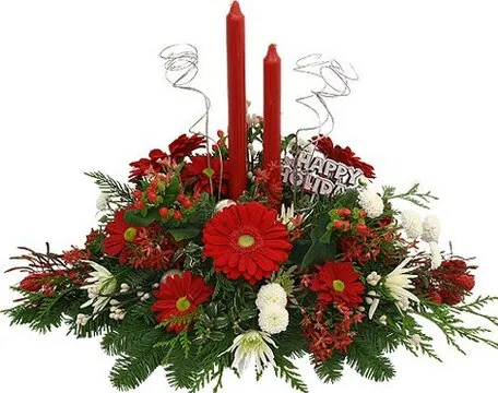 Augura un buon Natale con un centrotavola di gerbere e/o margherite e fiori misti di stagione dai toni rossi e bianchi, verde decorativo di stagione e candele. Adatto per le festività natalizie.