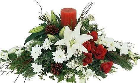 Augura un buon Natale con un centrotavola con Roselline, Gigli o lilium e fiori misti di stagione dai toni bianchi e rossi, verde decorativo e candele. Adatto per le festività natalizie.