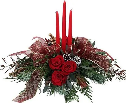 Augura un Buon Natale con un centrotavola di 3 Rose rosse, verde decorativo e candele. Adatto per le festività natalizie.