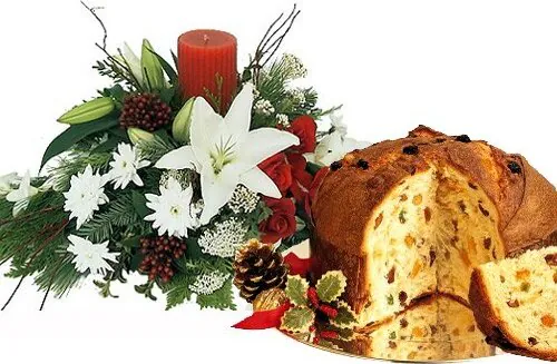 Augura un buon Natale con un centrotavola di rose, gigli o lilium e fiori misti di stagione dai toni bianchi e rossi, verde decorativo e candele, abbinato ad un panettone. Adatto per le festività natalizie.