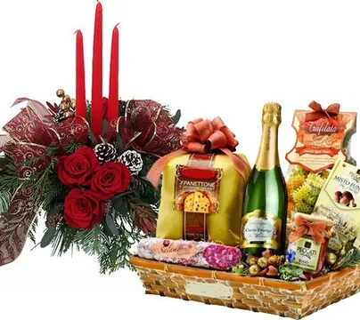 Augura un buon Natale con un centrotavola di 3 rose rosse, verde decorativo e candele, abbinato ad un cesto natalizio di prodotti locali con panettone e spumante. Adatto per le festività natalizie.