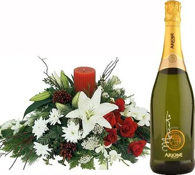Augura un buon Natale con un centrotavola di rose, gigli o lilium e fiori misti di stagione dai toni bianchi e rossi, verde decorativo e candele, abbinato ad una bottiglia di spumante. Adatto per le festività natalizie.