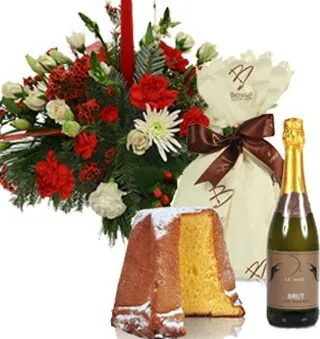 Augura un buon Natale con un centrotavola di rose e fiori misti di stagione dai toni bianchi e rossi, verde decorativo e candele, abbinato ad un pandoro ed una bottiglia di spumante. Adatto per le festività natalizie.