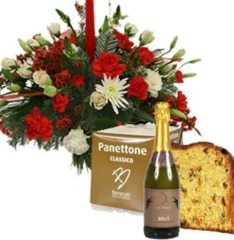 Augura un buon Natale con un centrotavola di rose e fiori misti di stagione dai toni rossi e bianchi, verde decorativo e candele, abbinato ad un panettone ed uno spumante. Adatto per le festività natalizie.