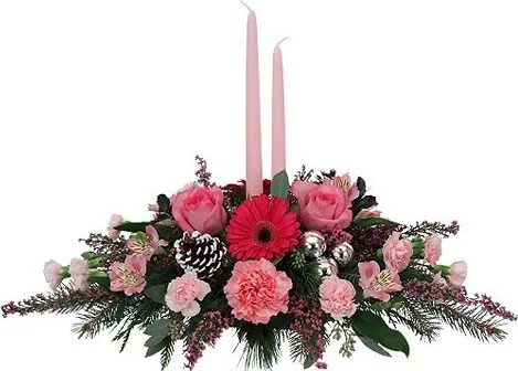 Augura un buon Natale con un centrotavola di rose, gerbere, alstroemerie e fiori misti di stagione dai toni pastello, verde decorativo e candele. Adatto per le festività natalizie.