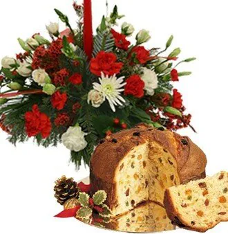 Augura un buon Natale con un centrotavola di rose e fiori misti di stagione di toni bianchi e rossi, verde decorativo e candele, abbinato ad un panettone. Adatto per le festività natalizie.