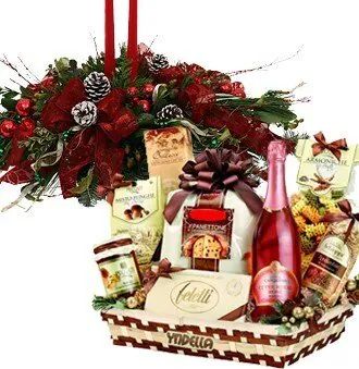 Augura un buon Natale con un centrotavola con decorativo e candele, abbinato ad un cesto di prodotti tipici. Adatto per le festività natalizie.