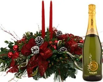 Augura un buon Natale con un centrotavola con verde decorativo e candele, abbinato ad una bottiglia di spumante. Adatto per le festività natalizie.
