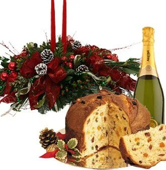 Augura un buon Natale con un centrotavola con verde decorativo e candele, abbinato ad un panettone ed una bottiglia di champagne. Adatto per le festività natalizie.