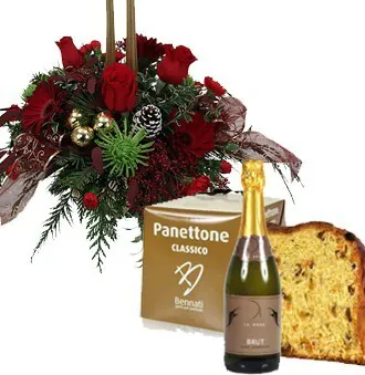 Augura un buon Natale con un centrotavola di rose, gerbere e fiori misti di stagione dai toni caldi, verde decorativo e candele, abbinato ad un panettone ed una bottiglia di spumante. Adatto per le festività natalizie.