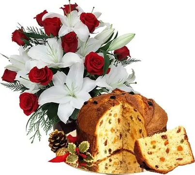 Augura un buon Natale con un bouquet di 12 rose rosse e gigli o lilium dai toni chiari confezionato con verde decorativo di stagione e candele, abbinato ad un panettone. Adatto per le festività natalizie.