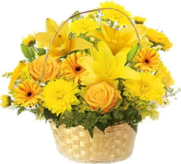 Invia Fiori a Al-Masayel, vendita online Cesto di roselline, lilium, gerbere e fiori misti dai toni solari