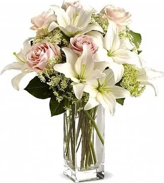Mazzo Funebre di Rose e Lilium dai toni chiari in elegante confezione con verde decorativo di stagione. Adatto per occasioni come lutto e funerale per esprimere cordoglio e porgere le vostre più sentite condoglianze alle persone care.