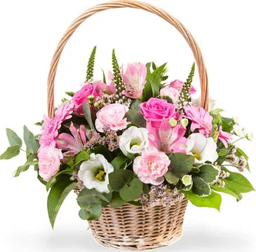 Elegante composizione in cesto con Roselline, Gerbere e fiori misti di stagione dai toni vivaci, confezionata con verde decorativo. Esprime allegria e felicità. Adatta per occasioni come nascita, amore, felicitazioni, compleanni e amicizia.