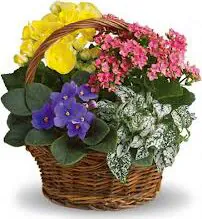 Composizione in cesto di piante fiorite miste dai toni allegri. Esprime allegria e felicità. Adatta per occasioni come nascita, felicitazioni, compleanni, matrimoni, anniversari e inaugurazioni.