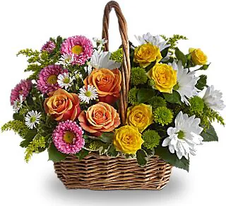 Composizione in cesto di roselline, margherite o gerbere e fiori misti di stagione dai toni allegri, confezionata con verde decorativo. Esprime amore, allegria e felicità. Adatta per occasioni come nascita, amore, felicitazioni, compleanni e amicizia.