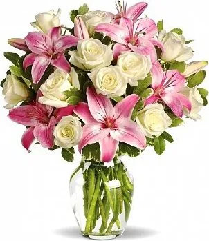 Rose e Lilium in Elegante Confezione a tono con Verde Decorativo di Stagione. Esprime amore, purezza e felicità. Adatto per occasioni come nascita, amore, felicitazioni, compleanni, matrimoni, anniversari e inaugurazioni.