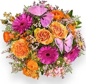 Bouquet di roselline, gerbere e fiori misti di stagione dai toni accesi, confezionato con verde decorativo. Esprime amore, allegria e felicità. Adatto per occasioni come nascita, amore, felicitazioni, compleanni e amicizia.