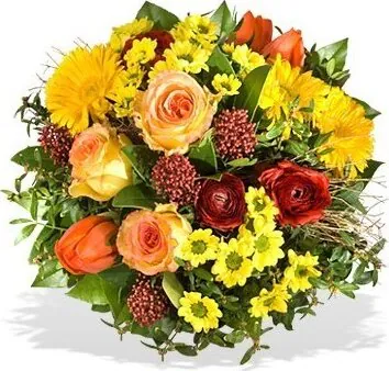 Bouquet di Fiori misti di stagione dai toni solari Giallo, Arancio e Rosso confezionato con verde decorativo. Esprime gioia ed energia. Adatto per occasioni come nascita, amore, felicitazioni, compleanni e amicizia.